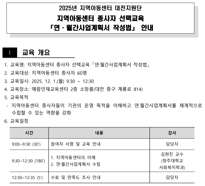 2025년 지역아동센터 종사자 선택교육 「연·월간사업계획서 작성법」을 다음과 같이 진행하오니, 많은 관심과 신청 바랍니다. 감사합니다.